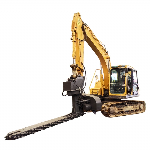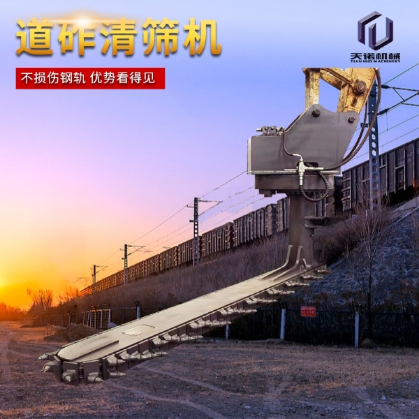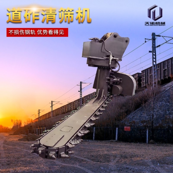 目前,鐵路交通發(fā)展迅速,對于年久的鐵路路基下面的石子需要定期更換,對于鐵路上的清渣機(jī)需要大型設(shè)備操作十分的不方面,采用人工又十分耗時,工作效率比較低下;為解決上述問題,克服現(xiàn)有技術(shù)的不足,天諾工程機(jī)械研發(fā)了一種能夠在狹小空間內(nèi)作業(yè)、操作簡單、效果高的鐵路清渣機(jī);鐵路清渣機(jī)包含扒渣鏈部、清渣板部、安裝部和連接部,安裝部設(shè)置在扒渣鏈部的上部,其用于與挖掘機(jī)連接;清渣板部設(shè)置在扒渣鏈部的尾端,清渣板部和扒渣鏈部通過連接部相連;扒渣鏈部包括鏈條,鏈條由若干首尾相連的鏈節(jié)組成,鏈節(jié)包括支座和設(shè)置在支座上的截齒;若干截齒呈波浪式陣列布置;安裝部包括上座板和下座板,上座板和下座板之間設(shè)置有回轉(zhuǎn)支承,上座板上部設(shè)置有兩個相互平行的大耳板。鐵路清渣機(jī)是為鐵路道咋清理而設(shè)計(jì)的一款鐵路專用屬具,鏈條式道咋清理機(jī)需安裝在150挖掘機(jī)前端,并從軌道外側(cè)位置清理,通過大扭矩馬達(dá)帶動免維護(hù)鏈條上作業(yè)鏈條上裝置超耐磨的合金屬具對道床道砟進(jìn)行連續(xù)清理的技術(shù),排列使得道砟的清理及更換更加簡單高 效,提高了施工速度同時節(jié)省了勞動力。